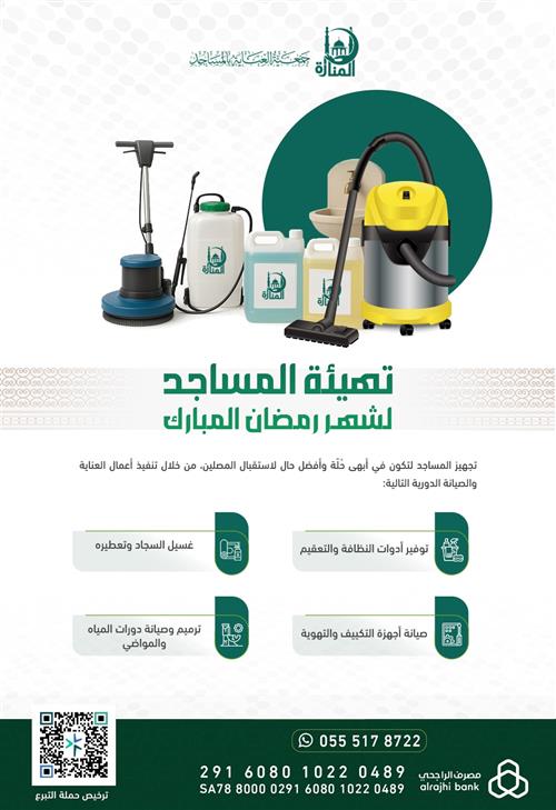 ساهم معنا في صيانة ونظافة وتأهيل المساجد استعدادًا لشهر رمضان المبارك، ليؤدي المصلون عباداتهم في بيئة طيبة عامرة بالإيمان والنقاء. 🌿 تبرعك يهيئ بيتًا من بيوت الله ليكون منارةً للخير والطمأنينة.